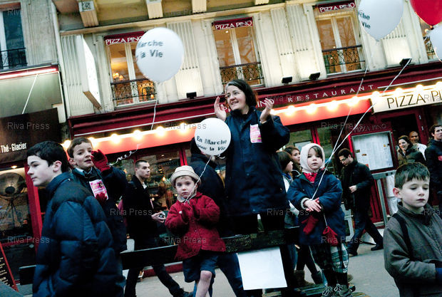 Légende : 23/01/2011 - Paris, FRANCE - Le collectif "En Marche pour la Vie" a organise une manifestation contre l'avortement et pour le developpement des aides à la maternite. PHOTO : RIJASOLO/RIVA PRESS.