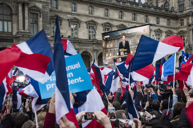 Légende : Les supporters d'Emmanuel Marcon decouvrent sur des ecrans geants son election a la Presidence de la Republique au soir du second tour de l'election presidentielle 2017 dans la cour du Musee du Louvre. Le 07/05/2017. /// Supporters of French president-elect Emmanuel Macron celebrate at the Louvre Museum in Paris on May 7, 2017, after the second round of the French presidential election. /// PHOTO Vincent Boisot