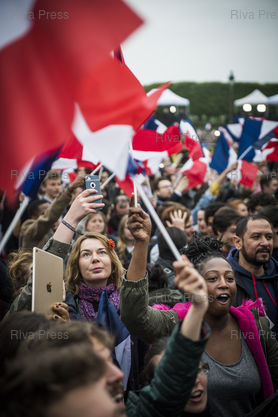 Légende : Les supporters d'Emmanuel Marcon celebrent son election a la Presidence de la Republique au soir du second tour de l'election presidentielle 2017 dans la cour du Musee du Louvre. Le 07/05/2017. /// Supporters of French president-elect Emmanuel Macron celebrate at the Louvre Museum in Paris on May 7, 2017, after the second round of the French presidential election. /// PHOTO Vincent Boisot