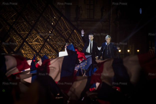 Légende : Emmanuel Marcon et sa femme Brigitte celebrent son election a la Presidence de la Republique au soir du second tour de l'election presidentielle 2017 dans la cour du Musee du Louvre. Le 07/05/2017. /// President-elect Emmanuel Macron and his wife Brigitte celebrate at the Louvre Museum in Paris on May 7, 2017, after the second round of the French presidential election. /// PHOTO Vincent Boisot