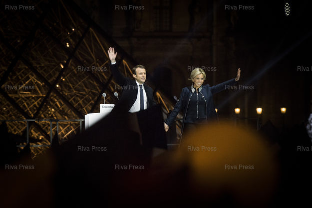 Légende : Emmanuel Marcon et sa femme Brigitte celebrent son election a la Presidence de la Republique au soir du second tour de l'election presidentielle 2017 dans la cour du Musee du Louvre. Le 07/05/2017. /// President-elect Emmanuel Macron and his wife Brigitte celebrate at the Louvre Museum in Paris on May 7, 2017, after the second round of the French presidential election. /// PHOTO Vincent Boisot