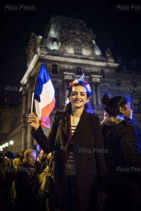 Légende : Les supporters d'Emmanuel Marcon celebrent son election a la Presidence de la Republique au soir du second tour de l'election presidentielle 2017 dans la cour du Musee du Louvre. Le 07/05/2017. /// Supporters of French president-elect Emmanuel Macron celebrate at the Louvre Museum in Paris on May 7, 2017, after the second round of the French presidential election. /// PHOTO Vincent Boisot