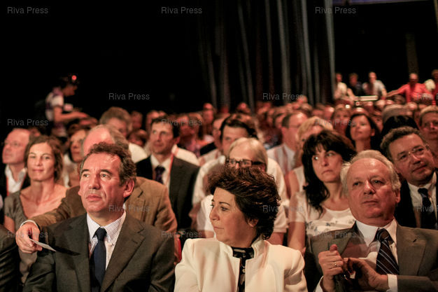 Légende : 24/05/2007-PARIS- François Bayrou (G), président du Mouvement démocrate (MoDem), dans les tribunes du Zénith pour le meeting de lancement de la campagne législative du nouveau parti centriste. Avec la présidente de Cap 21 Corinne Lepage (C) et le député européen Jean-Marie Cavada (D). PHOTO: Vincent NGUYEN / Riva Press ***
