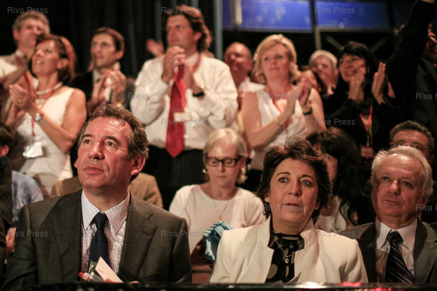 Caption : 24/05/2007-PARIS- François Bayrou (G), président du Mouvement démocrate (MoDem), dans les tribunes du Zénith pour le meeting de lancement de la campagne législative du nouveau parti centriste. Avec la présidente de Cap 21 Corinne Lepage (C) et le député européen Jean-Marie Cavada (D). PHOTO: Vincent NGUYEN / Riva Press ***
