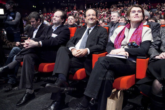 Légende : Paris, le 30 janvier 2011 - Francois Hollande (C), avec David Assouline (G) et Jean-Marc Germain (2eG) au rassemblement des secretaires de section du parti socialiste au Palais des congres.