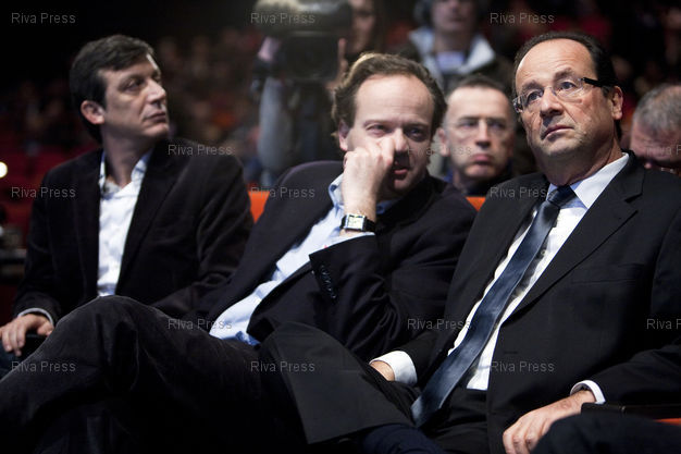 Légende : Paris, le 30 janvier 2011 - Francois Hollande (D), avec David Assouline (G) et Jean-Marc Germain (C) au rassemblement des secretaires de section du parti socialiste au Palais des congres.