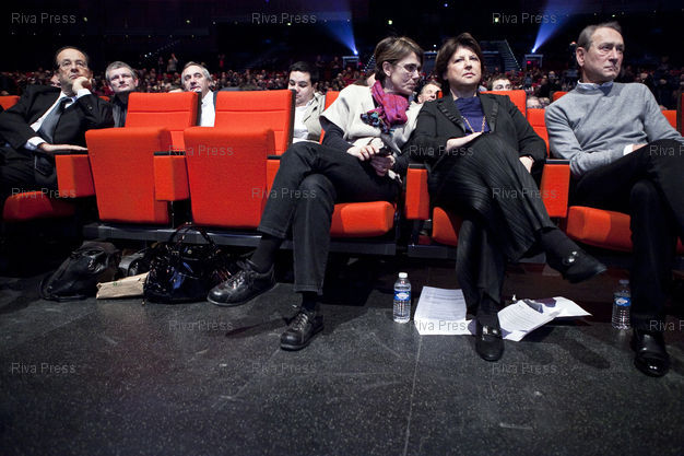 Légende : Paris, le 30 janvier 2011 - Martine Aubry (2eD), Bertrand Delanoe (D) et Francois Hollande (G) au rassemblement des secretaires de section du parti socialiste au Palais des congres.