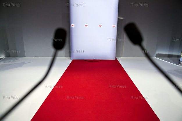 Légende : Paris, le 30 janvier 2011 - Micros, decor et tapis rouge sur la scene du grand amphitheatre du Palais des congres pour le rassemblement annuel des secretaires de section du parti socialiste en vue des prochaines elections cantonales et des primaires a gauche pour l'election presidentielle de 2012.