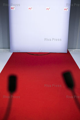 Légende : Paris, le 30 janvier 2011 - Micros, decor et tapis rouge sur la scene du grand amphitheatre du Palais des congres pour le rassemblement annuel des secretaires de section du parti socialiste en vue des prochaines elections cantonales et des primaires a gauche pour l'election presidentielle de 2012.