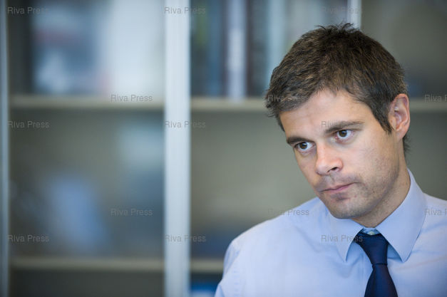 Caption : 10/12/2008 - PARIS, France - Laurent Wauquiez, secretaire d'Etat charge de l'Emploi, repond a une interview dans son bureau du ministere des finances a Bercy. /// French Junior Minister for Employment Laurent Wauquiez in his office. On December 10, 2008. ///
