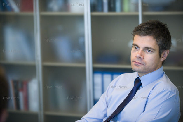 Caption : 10/12/2008 - PARIS, France - Laurent Wauquiez, secretaire d'Etat charge de l'Emploi, repond a une interview dans son bureau du ministere des finances a Bercy. /// French Junior Minister for Employment Laurent Wauquiez in his office. On December 10, 2008. ///