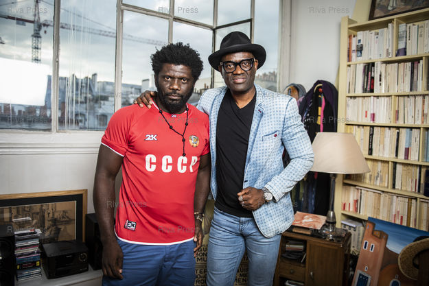 Légende : Rencontre entre les ecrivains Alain Mabanckou et Gauz a Paris pour la sortie de leur nouveaux livres pendant l'ete 2018, "Camarade Papa" (Gauz) et "Les cigognes sont immortelles" (Alain Mabanckou). Le 05/07/2018. /// The writers Alain Mabanckou and Gauz in Paris on July 5, 2018. /// PHOTO Vincent Boisot