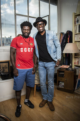 Légende : Rencontre entre les ecrivains Alain Mabanckou et Gauz a Paris pour la sortie de leur nouveaux livres pendant l'ete 2018, "Camarade Papa" (Gauz) et "Les cigognes sont immortelles" (Alain Mabanckou). Le 05/07/2018. /// The writers Alain Mabanckou and Gauz in Paris on July 5, 2018. /// PHOTO Vincent Boisot