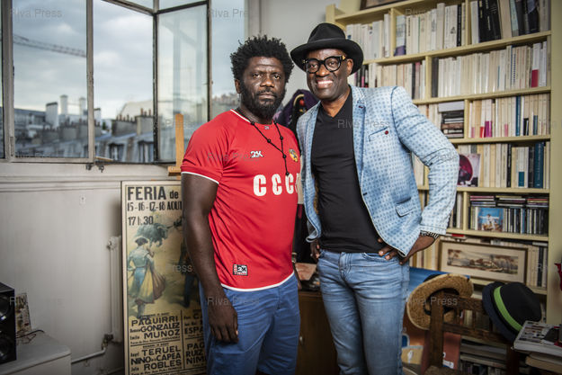 Légende : Rencontre entre les ecrivains Alain Mabanckou et Gauz a Paris pour la sortie de leur nouveaux livres pendant l'ete 2018, "Camarade Papa" (Gauz) et "Les cigognes sont immortelles" (Alain Mabanckou). Le 05/07/2018. /// The writers Alain Mabanckou and Gauz in Paris on July 5, 2018. /// PHOTO Vincent Boisot