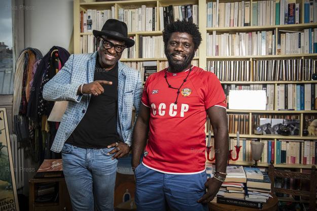 Légende : Rencontre entre les ecrivains Alain Mabanckou et Gauz a Paris pour la sortie de leur nouveaux livres pendant l'ete 2018, "Camarade Papa" (Gauz) et "Les cigognes sont immortelles" (Alain Mabanckou). Le 05/07/2018. /// The writers Alain Mabanckou and Gauz in Paris on July 5, 2018. /// PHOTO Vincent Boisot