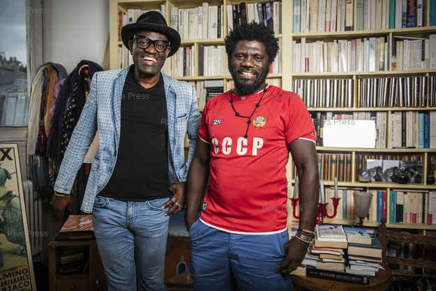 Légende : Rencontre entre les ecrivains Alain Mabanckou et Gauz a Paris pour la sortie de leur nouveaux livres pendant l'ete 2018, "Camarade Papa" (Gauz) et "Les cigognes sont immortelles" (Alain Mabanckou). Le 05/07/2018. /// The writers Alain Mabanckou and Gauz in Paris on July 5, 2018. /// PHOTO Vincent Boisot
