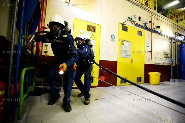 Légende : Les equipes de pompiers specialises de la centrale nucleaire de Saint-Laurent des eaux font un exercice d'entrainement. Saint-Laurent des eaux,FRANCE-10/01/2009