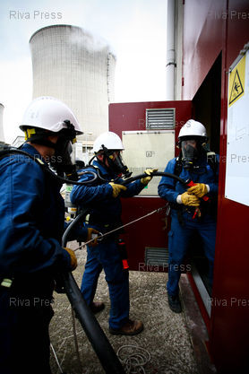 Légende : Les equipes de pompiers specialises de la centrale nucleaire de Saint-Laurent des eaux font un exercice d'entrainement. Saint-Laurent des eaux,FRANCE-10/01/2009