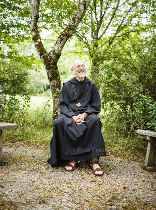 Légende : En Calcat, le 2 juillet 2019 - Portrait de David-Marc d'Hamonville (Frere David), Pere abbe de l'Abbaye benedictine d'En Calcat. Ici aux "jardins parloirs" de l'Abbaye. PHOTO: Vincent NGUYEN / Riva Press