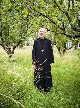 Légende : En Calcat, le 2 juillet 2019 - Portrait de David-Marc d'Hamonville (Frere David), Pere abbe de l'Abbaye benedictine d'En Calcat. Ici dans les vergers de l'Abbaye. PHOTO: Vincent NGUYEN / Riva Press