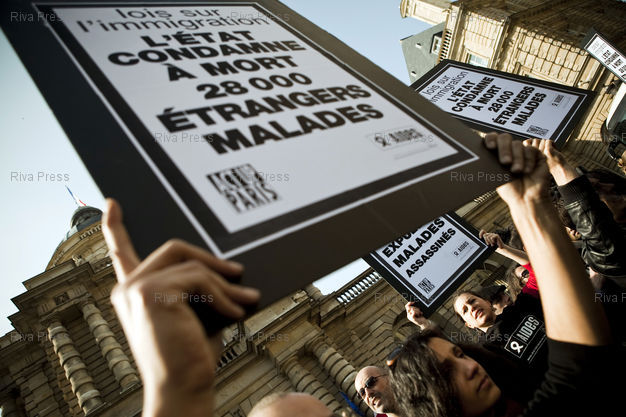 *** Paris, FRANCE, May 3, 2011 - Associations Act Up Paris and AIDES demonstrate in front of the Senate to denounce reforms of the government on immigrations laws which could authorize to expulse sick illegal immigrants. PHOTO: Vincent NGUYEN / Riva Press.