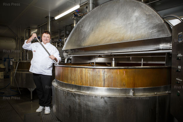Légende : Virazeil, le 23 janvier 2018 - Portrait de Lucien Georgelin, dirigeant et fondateur de la societe qui porte son nom, numero 2 de la confiture en France. Ici devant un chaudron dans l'atelier de fabrication de son usine de Virazeil (Lot-Et-Garonne). PHOTO: Vincent NGUYEN / Riva Press