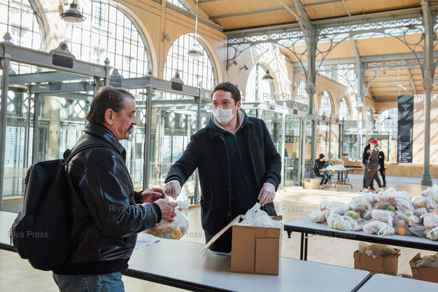 Légende : Des benevoles distribuent des sacs de nourriture a des personnes demunies (sans-abris notamment), au Carreau du Temple, Paris, le 24 mars 2020. Organisee par l'association Aurore, en partenariat avec la mairie de Paris et l'Etat, la distribution a pour but de toucher des personnes encore plus isolees et precaires du fait du confinement mis en place pour lutter contre le coronavirus Covid-19. © Lucien Lung / Riva