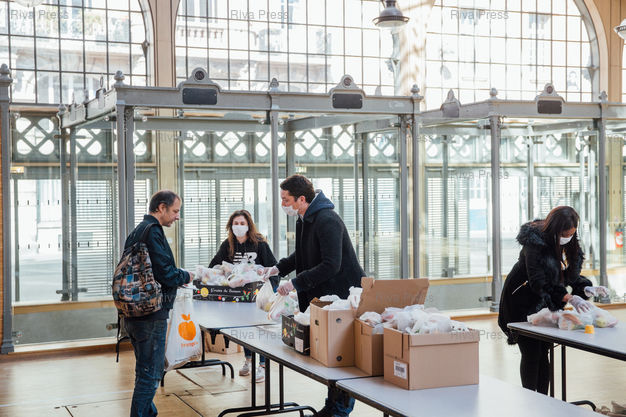 Légende : Des benevoles distribuent des sacs de nourriture a des personnes demunies (sans-abris notamment), au Carreau du Temple, Paris, le 24 mars 2020. Organisee par l'association Aurore, en partenariat avec la mairie de Paris et l'Etat, la distribution a pour but de toucher des personnes encore plus isolees et precaires du fait du confinement mis en place pour lutter contre le coronavirus Covid-19. © Lucien Lung / Riva