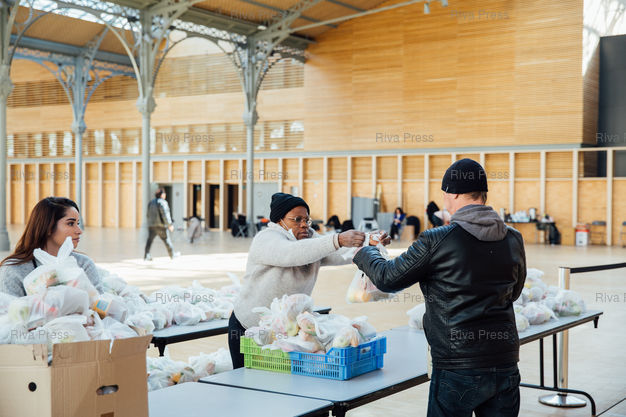 Légende : Des benevoles distribuent des sacs de nourriture a des personnes demunies (sans-abris notamment), au Carreau du Temple, Paris, le 24 mars 2020. Organisee par l'association Aurore, en partenariat avec la mairie de Paris et l'Etat, la distribution a pour but de toucher des personnes encore plus isolees et precaires du fait du confinement mis en place pour lutter contre le coronavirus Covid-19. © Lucien Lung / Riva