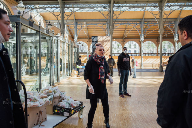 Légende : Distribution de nourriture organisee par l'association Aurore, en partenariat avec la mairie de Paris et l'Etat, au Carreau du Temple, Paris, le 24 mars 2020. © Lucien Lung / Riva