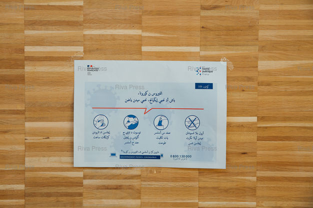 Légende : Affiche en arabe editee par le gouvernement francais, detaillant les mesures de prevention a prendre pour se premunir contre le coronavirus. Distribution de nourriture organise par l'association Aurore, en partenariat avec la mairie de Paris et l'Etat, au Carreau du Temple, Paris, le 24 mars 2020. © Lucien Lung / Riva
