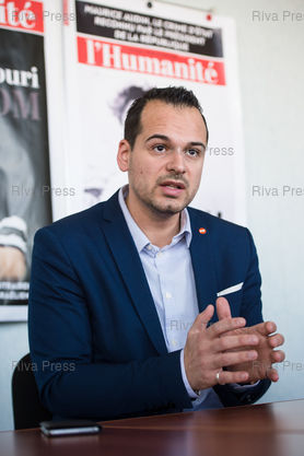 Légende : Jeremy Bacchi, secretaire general de la federation des Bouches-du-Rhone du Parti Communiste Francais (PCF) donne une conference de presse pour manifester son soutien au quotidien l'Humanite et pour appeler les adherents du parti a soutenir le journal. Marseille le 08 fevrier 2019 ***** PHOTO : CLEMENT MAHOUDEAU / RIVA PRESS