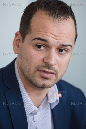 Légende : Jeremy Bacchi, secretaire general de la federation des Bouches-du-Rhone du Parti Communiste Francais (PCF) donne une conference de presse pour manifester son soutien au quotidien l'Humanite et pour appeler les adherents du parti a soutenir le journal. Marseille le 08 fevrier 2019 ***** PHOTO : CLEMENT MAHOUDEAU / RIVA PRESS