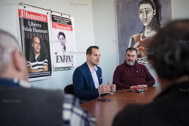 Légende : Jeremy Bacchi, secretaire general de la federation des Bouches-du-Rhone du Parti Communiste Francais (PCF) et Olivier Mateu, secretaire general de l'Union Departementale des Bouches du Rhone (UD13) de la Confederation Generale du Travail (CGT), donnent une conference de presse commune pour manifester leur soutien au quotidien l'Humanite et pour appeler les adherents des deux organisations a soutenir le journal. Marseille le 08 fevrier 2019 ***** PHOTO : CLEMENT MAHOUDEAU / RIVA PRESS