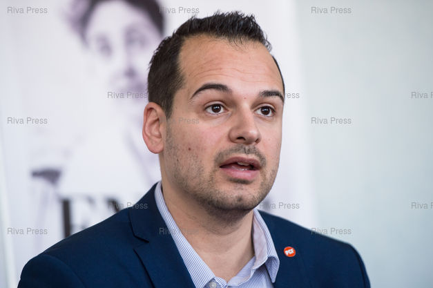 Légende : Jeremy Bacchi, secretaire general de la federation des Bouches-du-Rhone du Parti Communiste Francais (PCF) donne une conference de presse pour manifester son soutien au quotidien l'Humanite et pour appeler les adherents du parti a soutenir le journal. Marseille le 08 fevrier 2019 ***** PHOTO : CLEMENT MAHOUDEAU / RIVA PRESS