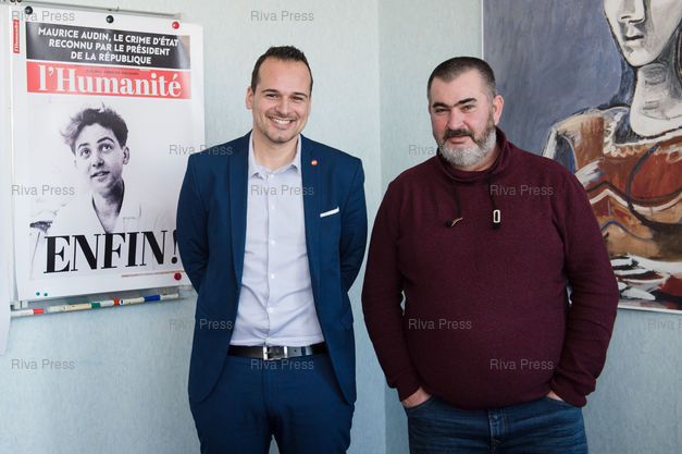 Légende : Jeremy Bacchi, secretaire general de la federation des Bouches-du-Rhone du Parti Communiste Francais (PCF) et Olivier Mateu, secretaire general de l'Union Departementale des Bouches du Rhone (UD13) de la Confederation Generale du Travail (CGT), donnent une conference de presse commune pour manifester leur soutien au quotidien l'Humanite et pour appeler les adherents des deux organisations a soutenir le journal. Marseille le 08 fevrier 2019 ***** PHOTO : CLEMENT MAHOUDEAU / RIVA PRESS