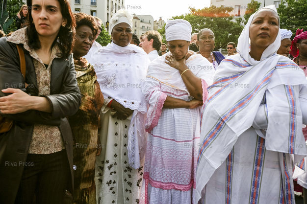 Légende : 06/07/2007-PARIS-Rassemblement place Gambetta en mémoire de Lamine Dieng, mort à Paris le 17 juin 2007 lors d'une interpellation par la police. La mère de Lamine Dieng (2e D au 1er plan). PHOTO: Vincent NGUYEN / Riva Press ***