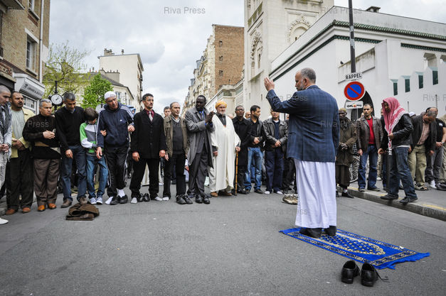 Légende : Quelques dizaines de personnes manifestent devant la mosquee de Paris a l'appel du collectif Cheickh Yassine pour protester contre les declarations controversees du recteur Dalil Boubakeur dans le magazine israelien "SVP Israel". Ils lui reprochent egalement certaines prises de position recentes sur l'Islam et les musulmans de France. Les responsables de la mosquee ayant decide de fermer le batiment, l'organisateur de la manifestation (Abdelhakim Sefrioui) dirige une priere dans la rue pour les nombreux fideles restes a la porte. A Paris, le 17/04/2009 /// A few dozen people demonstrated in front of the Paris mosque at the call of the collective Cheickh Yassin to protest against the controversial statements of the rector Dalil Boubakeur in the Israeli magazine "SVP Israel" .After the mosque officials decided to close the building, the organiser of the demonstration (Abdelhakim Sefrioui) led a prayer in the street for the many believers who remained at the door. On April 17, 2009 /// PHOTO Vincent Boisot