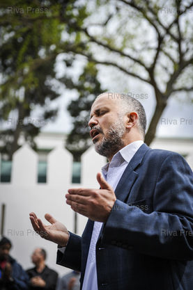 Légende : Quelques dizaines de personnes manifestent devant la mosquee de Paris a l'appel du collectif Cheickh Yassine pour protester contre les declarations controversees du recteur Dalil Boubakeur dans le magazine israelien "SVP Israel". Ils lui reprochent egalement certaines prises de position recentes sur l'Islam et les musulmans de France. Les responsables de la mosquee ayant decide de fermer le batiment, l'organisateur de la manifestation (Abdelhakim Sefrioui) dirige une priere dans la rue pour les nombreux fideles restes a la porte. A Paris, le 17/04/2009 /// A few dozen people demonstrated in front of the Paris mosque at the call of the collective Cheickh Yassin to protest against the controversial statements of the rector Dalil Boubakeur in the Israeli magazine "SVP Israel" .After the mosque officials decided to close the building, the organiser of the demonstration (Abdelhakim Sefrioui) led a prayer in the street for the many believers who remained at the door. On April 17, 2009 /// PHOTO Vincent Boisot