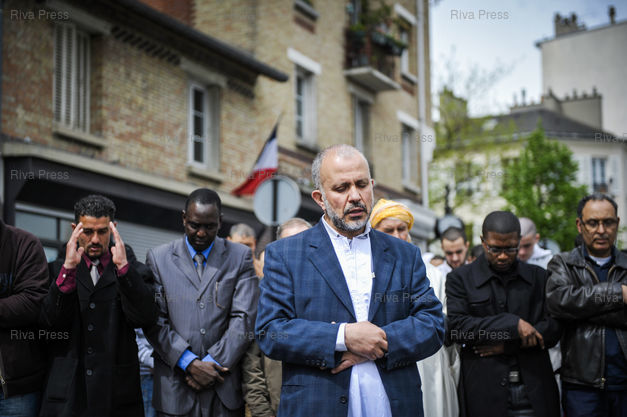 Légende : Quelques dizaines de personnes manifestent devant la mosquee de Paris a l'appel du collectif Cheickh Yassine pour protester contre les declarations controversees du recteur Dalil Boubakeur dans le magazine israelien "SVP Israel". Ils lui reprochent egalement certaines prises de position recentes sur l'Islam et les musulmans de France. Les responsables de la mosquee ayant decide de fermer le batiment, l'organisateur de la manifestation (Abdelhakim Sefrioui) dirige une priere dans la rue pour les nombreux fideles restes a la porte. A Paris, le 17/04/2009 /// A few dozen people demonstrated in front of the Paris mosque at the call of the collective Cheickh Yassin to protest against the controversial statements of the rector Dalil Boubakeur in the Israeli magazine "SVP Israel" .After the mosque officials decided to close the building, the organiser of the demonstration (Abdelhakim Sefrioui) led a prayer in the street for the many believers who remained at the door. On April 17, 2009 /// PHOTO Vincent Boisot