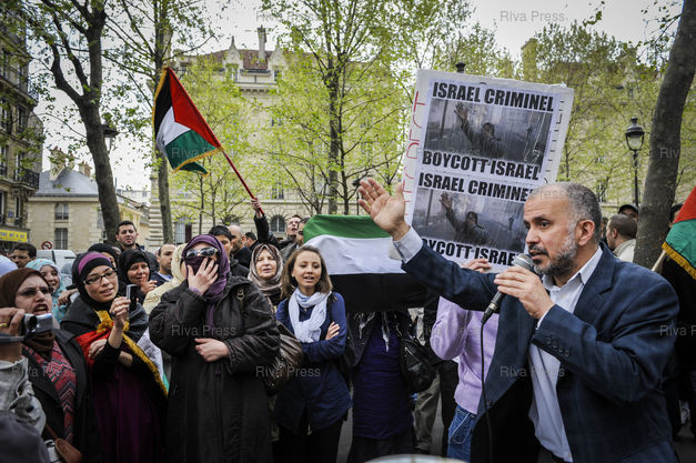 Légende : Quelques dizaines de personnes manifestent devant la mosquee de Paris a l'appel du collectif Cheickh Yassine pour protester contre les declarations controversees du recteur Dalil Boubakeur dans le magazine israelien "SVP Israel". Ils lui reprochent egalement certaines prises de position recentes sur l'Islam et les musulmans de France. Sur la droite, l'organisateur de la manifestation Abdelhakim Sefrioui sur la Place Monge voisine. A Paris, le 17/04/2009 /// A few dozen people demonstrated in front of the Paris mosque at the call of the collective Cheickh Yassin to protest against the controversial statements of the rector Dalil Boubakeur in the Israeli magazine "SVP Israel". On the right, the organiser of the demonstration Abdelhakim Sefrioui on the nearby Place Monge. On April 17, 2009 /// PHOTO Vincent Boisot