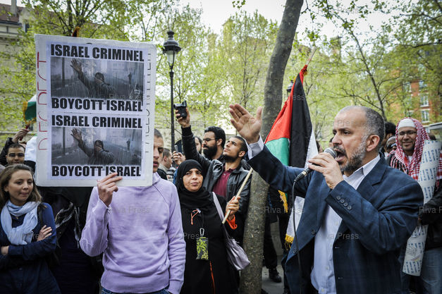 Légende : Quelques dizaines de personnes manifestent devant la mosquee de Paris a l'appel du collectif Cheickh Yassine pour protester contre les declarations controversees du recteur Dalil Boubakeur dans le magazine israelien "SVP Israel". Ils lui reprochent egalement certaines prises de position recentes sur l'Islam et les musulmans de France. Sur la droite, l'organisateur de la manifestation Abdelhakim Sefrioui sur la Place Monge voisine. A Paris, le 17/04/2009 /// A few dozen people demonstrated in front of the Paris mosque at the call of the collective Cheickh Yassin to protest against the controversial statements of the rector Dalil Boubakeur in the Israeli magazine "SVP Israel". On the right, the organiser of the demonstration Abdelhakim Sefrioui on the nearby Place Monge. On April 17, 2009 /// PHOTO Vincent Boisot