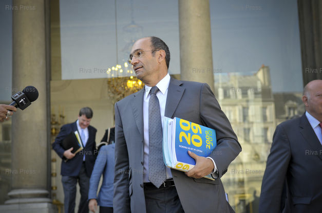 Légende : 26/09/2008 - PARIS, France - Sortie du conseil des ministres au palais de l'Elysee ou Eric Woerth a presente le projet de loi de finance 2009.