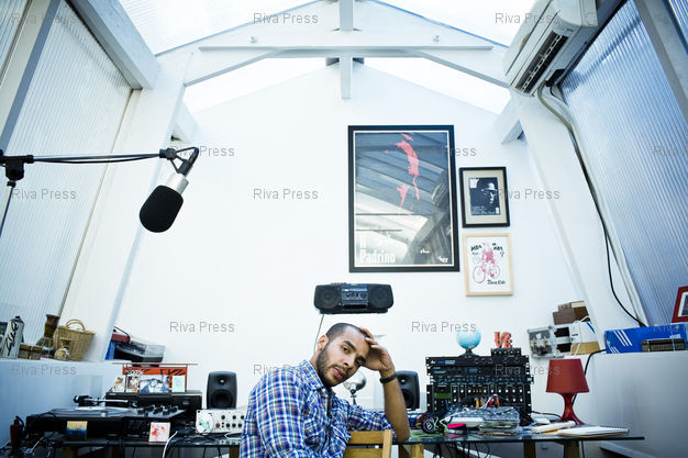 Légende : Paris, le 17 aout 2009 - Portrait de DJ Mehdi, chez lui, devant son home studio. PHOTO: Vincent NGUYEN / Riva Press