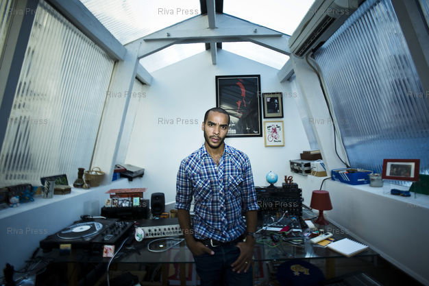 Légende : Paris, le 17 aout 2009 - Portrait de DJ Mehdi, chez lui, devant son home studio. PHOTO: Vincent NGUYEN / Riva Press