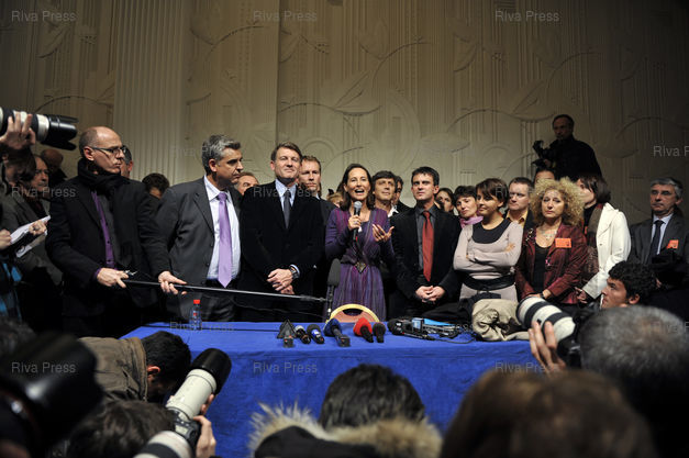 A l'issue de la reunion qui vient de designer sa rivale premier secretaire, Segolene Royal entouree de ses fideles (Vincent Peillon, David Assouline, Manuel Valls et Najat Vallaud-Belkacem) s'adresse aux journalistes dans une conference de presse.