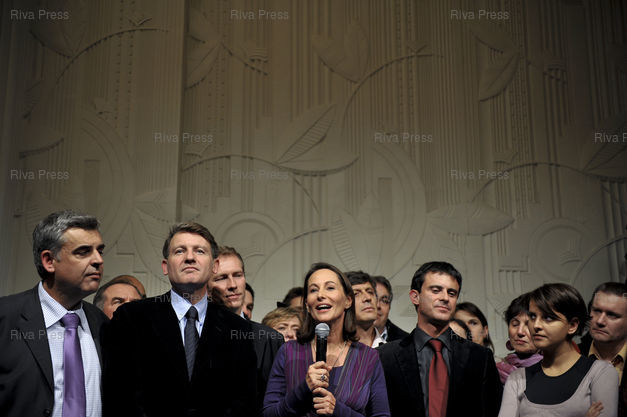 A l'issue de la reunion qui vient de designer sa rivale premier secretaire, Segolene Royal entouree de ses fideles (Vincent Peillon, David Assouline, Manuel Valls et Najat Vallaud-Belkacem) s'adresse aux journalistes dans une conference de presse.