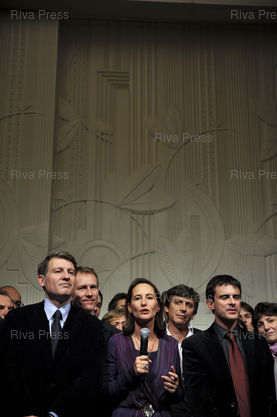 A l'issue de la reunion qui vient de designer sa rivale premier secretaire, Segolene Royal entouree de ses fideles (Vincent Peillon, David Assouline et Manuel Valls) s'adresse aux journalistes dans une conference de presse.