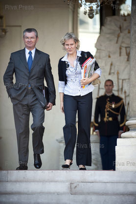 Nadine Morano and Henri de Raincourt leave the weekly cabinet meeting at the Elysee palace.