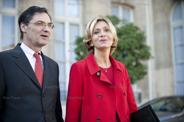 Patrick Devedjian and Valérie Pécresse leave the weekly cabinet meeting at the Elysee palace.